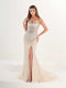 This shimmer jersey gown stands out with a large, structured bow detail at the bodice and a front keyhole cutout. The high leg slit adds drama to this playful, yet seductive silhouette. A lace-up corset back enhances both style and fit, trailing down to a sweeping mermaid hem that elongates...
