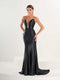 Be the belle of the ball in this form fitting jersey gown featuring a plunging halter neckline.