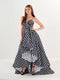 This ball gown combines retro charm with contemporary detail. The bodice features a white sweetheart neckline with black polka dots and striking keyhole cutouts, delicately accented by silver crystal bow appliqués. Vertical black piping flatters the torso, drawing the eye inward and creating a beautifully contoured silhouette. The voluminous A-line skirt flows from the waist in rich black organza with bold white polka dots, bringing playful elegance and vintage-inspired flair. The back of the gown features a sheer illusion panel with structured boning that mirrors the front’s tailored shape while offering breathable comfort. The full skirt continues the polka dot theme seamlessly, sweeping out into a classic ball gown shape that’s both dramatic and easy to move in.