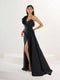 This gown features a draped scoop neckline with subtle pleats that gently contour the bust. Spaghetti straps add a delicate, modern touch while leading into a sculpted bodice that flatters the waist. The bodice is adorned with shimmering glitter mesh panels that add sparkle without overwhelming the clean design. Draped ruching at the waist and hips enhances curves and slims the silhouette. A thigh-high slit adds a touch of drama and movement, perfect for showing off your legs and statement heels. The back is both simple and striking, featuring a low open scoop back that reveals just enough skin to keep it sexy yet elegant. The soft jersey fabric skims over the hips and glides into a gentle sweep train, offering fluid motion and elongating the frame. The clean lines and seamless back make this gown an easy favorite for sleek, statuesque styling.