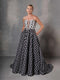 This bold and flirty high-low gown wear both side (inside out) features a structured sweetheart neckline with a deep illusion V inset, creating a dramatic yet elegant focal point. The dress is crafted in black organza taffeta with playful white polka dots, giving it a vintage-meets-modern twist. The layered asymmetrical hemline reveals a shorter front that highlights the legs while the longer layers cascade with movement and flair. Perfectly balanced, the silhouette offers volume without overwhelming the figure, while thin straps keep the look sleek and youthful. The back of the gown stuns with a low, scooped open back, adding a sultry contrast to the fun and playful front. The high-low skirt flows gracefully into a soft sweep, allowing the polka dot pattern to carry through consistently. The fitted bodice ensures a flattering silhouette while maintaining comfort and security.