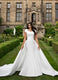 Radiating refined elegance, this ivory nude gown hugs the figure in shimmering glitter tulle and intricate appliqué. The cap-sleeve neckline and sculpted bodice offer graceful charm, while the flared skirt flows into a soft, sweeping train. A flawless choice for brides seeking sophistication with subtle sparkle.