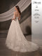 Stretch crepe strapless scoop neck corset bodice fit & flare gown with 3D floral applique & train.
