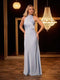 A-line gown with draped bodice, long sleeve and slit detail in the skirt.