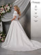 Slim style in stretch charmeuse with square neckline and puffy sleeves, fitted below elbow level. Fitted sleeves area made in sheer chantilly lace. Slim skirt with pleating on stomach have side split with inserted lace panel.